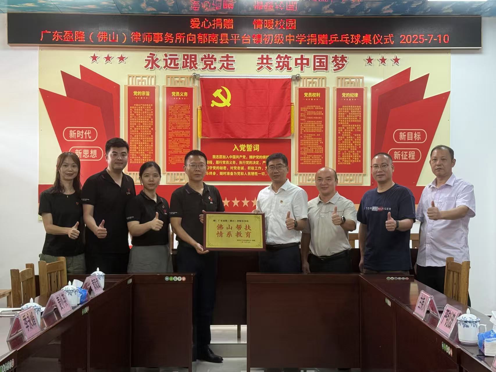 最后,廣東盈?。ǚ鹕剑┞蓭熓聞账硐驅W校正式移交乒乓球臺,校長代表學校向律所回贈“佛山幫扶 情系教育”愛心牌匾,以表謝意。雙方代表及師生共同合影留念。