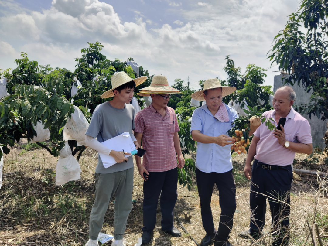 ▲圖為楊偉成(右二)與種植戶交流黃皮種植技術