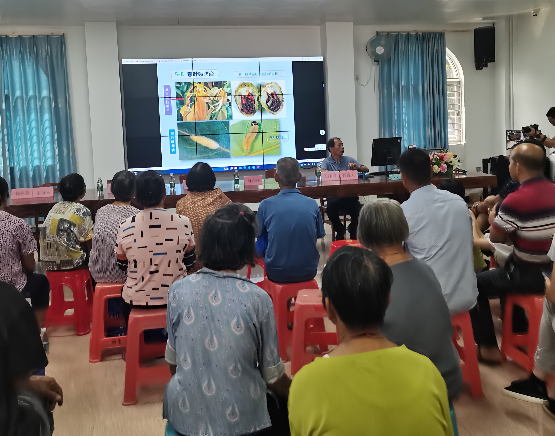 培訓課上,華南農業大學果樹研究院王澤槐教授通過案例分析,深入淺出地講授荔枝病蟲害防治、科學施肥、?;ū9胧┮约安珊蠊芾淼确矫婵茖W防治技術,結合當地“狀元紅”荔枝品種的改良注意事項進行講解,深受農戶們的歡迎。
